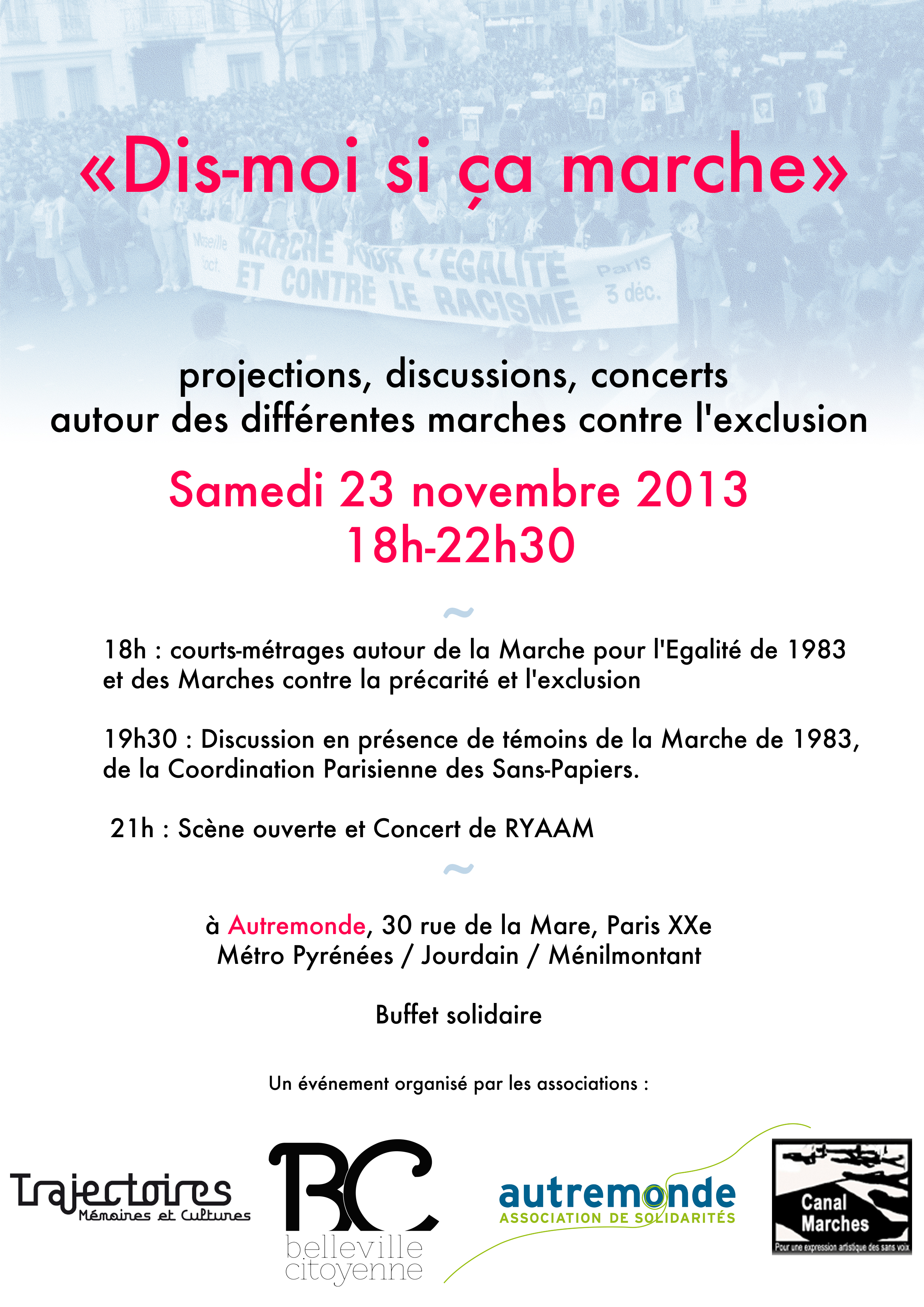 Loin des commémorations aseptisées qui vont bon train actuellement, nous proposons une après-midi/soirée gratuite de projections, discussions, concerts, autour de ces différentes marches contre l’exclusion.