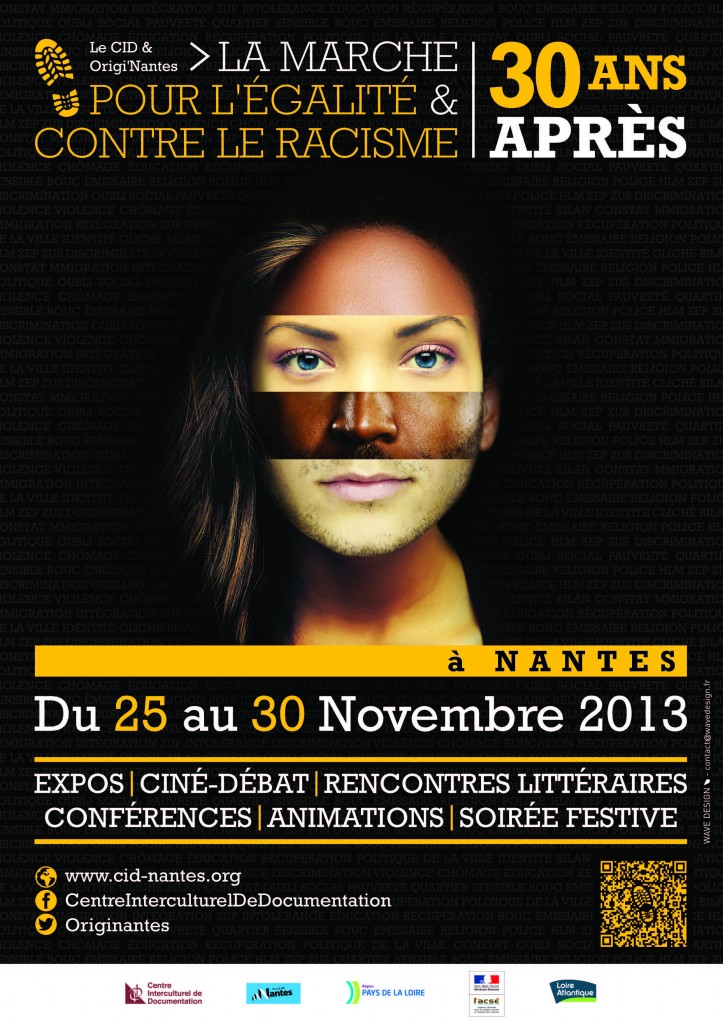 CID-AFFICHE-A4-avec-logo-723x1024L’initiative de la Marche pour l’égalité et contre le racisme de 1983 naît en raison de l’enchaînement des meurtres à caractères racistes, et du maintien des classes populaires et immigrées dans des conditions de vie déplorables. Trente ans après, le Centre Interculturel de Documentation (C.I.D) – Origi’Nantes souhaite revenir sur les différentes transformations fondamentales qui se sont opérées au sein de la société française entre 1983 et 2013. Dans ce cadre, le C.I.D – Origi’Nantes propose de participer aux différentes rencontres (expos, ciné-débat, conférences, rencontres littéraires) qui rythmeront la semaine du 25 au 30 Novembre 2013. L’occasion de rencontrer, de partager et d’échanger autour de questions fédératrices.